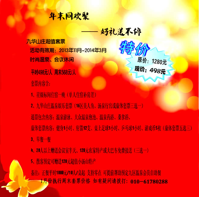 优惠促销 当前位置:北京九华山庄 > 优惠促销 > 时尚温泉-会议休闲超值两日游